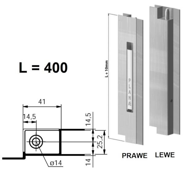 Zamek 400mm burty aluminiowej PLAN lewy wzmocniony z noskiem